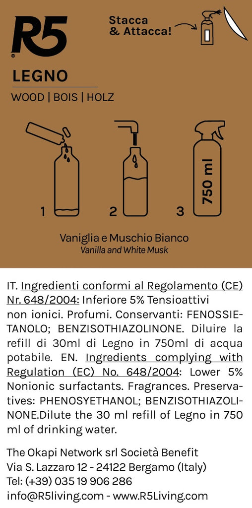 R5 Wood surface cleaner refill is specific for the daily cleaning of parquet floors and all wooden surfaces, such as furniture, doors, fixtures and panels. Its formulation does not dull and does not remove the finish of the parquet. Cleanses thoroughly while fully respecting surfaces. Maintains the natural hydration of the wood.