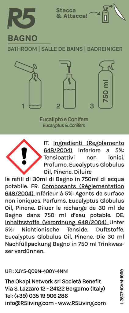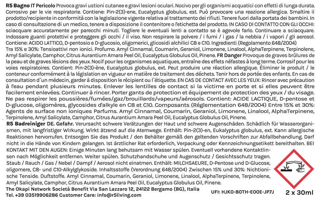 R5 Bathroom is vegan friendly, not tested on animals and reduces waste.The surfactants are of vegetal origin, deriving from the circular economy from corn, sugar cane and beet processing waste. Surfactants are biodegradable (Reg. 648/2004/EC). Food coloring. Our products are all MADE IN ITALY.