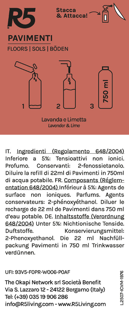 Each box of R5 Floor cleaner kit contains 2 refills for the preparation of 2 1000ml bottles of ready-to-use product.