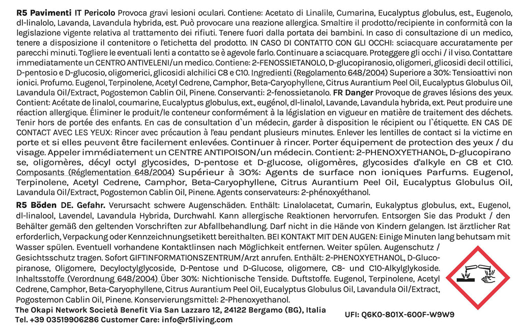 R5 Degreaser isvegan friendly, not tested on animalsand reduces waste.The surfactants are of vegetal origin, deriving from the circular economy from corn, sugar cane and beet processing waste. Surfactants are biodegradable (Reg. 648/2004/EC). Food coloring. Our products are allMADE IN ITALY.
