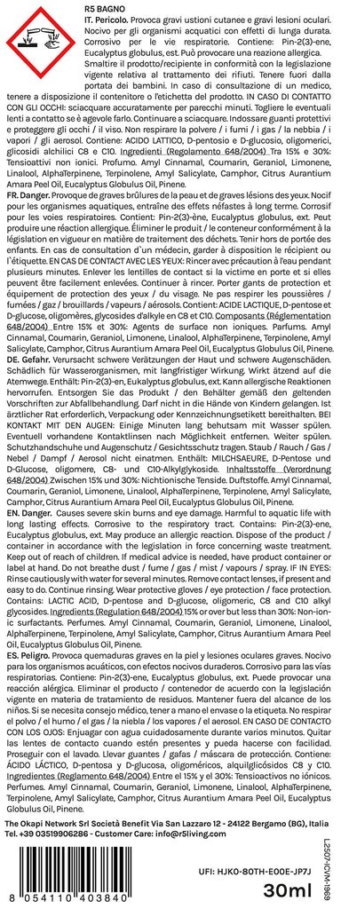 El baño R5 es apto para veganos, no probado en animales y reduce el desperdicio.Los tensioactivos son de origen vegetal, derivados de la economía circular a partir de residuos del procesamiento de maíz, caña de azúcar y remolacha. Los tensioactivos son biodegradables (Reg. 648/2004/CE). Colorante alimenticio. Nuestros productos son todos HECHO EN ITALIA.