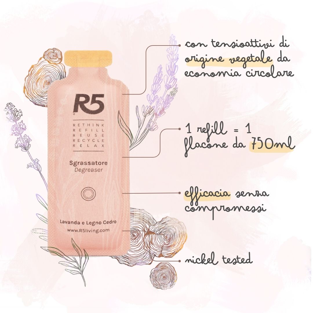 R5 Desengrasante es apto para veganos, los tensioactivos son de origen vegetal, derivados de la economía circular a partir de los residuos del procesamiento del maíz, la caña de azúcar y la remolacha. Nuestros productos Kit Spray para superficies y Recambios para superficies son todos FABRICADOS EN ITALIA.