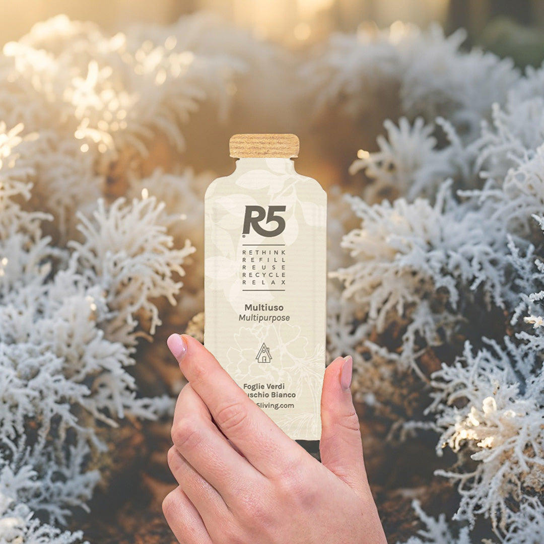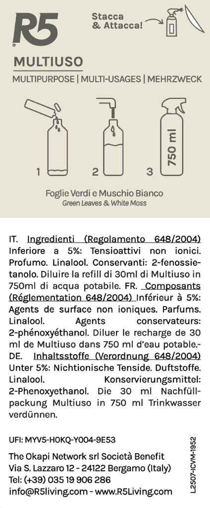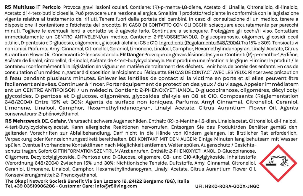 R5 Multi-usage est végétalien, non testé sur les animaux et réduit les déchets. Les agents tensioactifs sont d'origine végétale, dérivés, dans le cadre d'une économie circulaire, de déchets issus de la transformation du maïs, de la canne à sucre et de la betterave. Les tensioactifs sont biodégradables (règlement 648/2004/CE). Colorants alimentaires. Tous nos produits sont fabriqués en Italie.