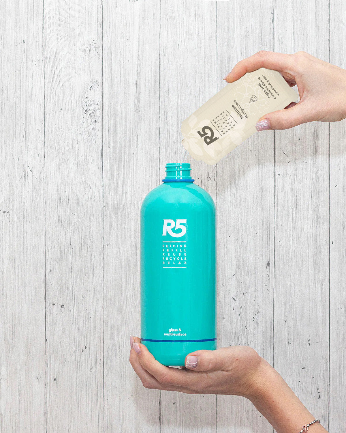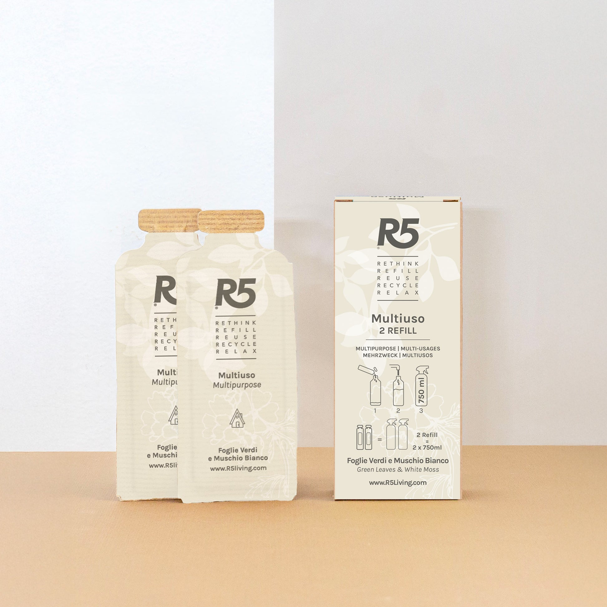 Chaque boîte de R5 Refill Multi-usage contient 2 recharges pour la préparation de 2 flacons de 750ml de produit prêt à l’emploi.