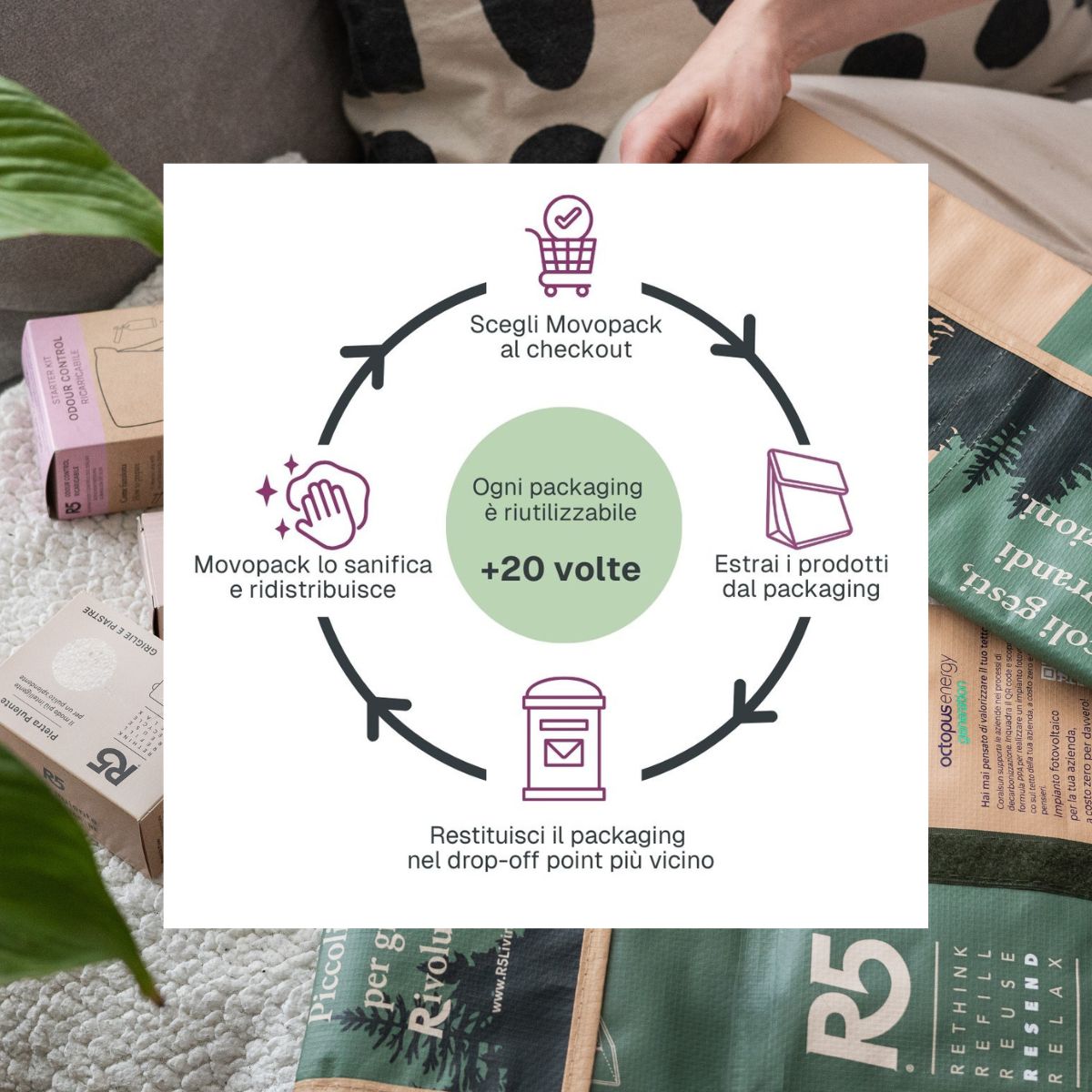 Progettato in collaborazione con Movopack, azienda italiana innovativa e leader nelle soluzioni di packaging restituibile, B Corp da maggio 2025. L'iniziativa contribuisce a ridurre in modo significativo il consumo di risorse e la produzione di rifiuti: grazie a questa soluzione, ottimizziamo i processi logistici e riduciamo fino al 98% dei rifiuti da imballaggi monouso.