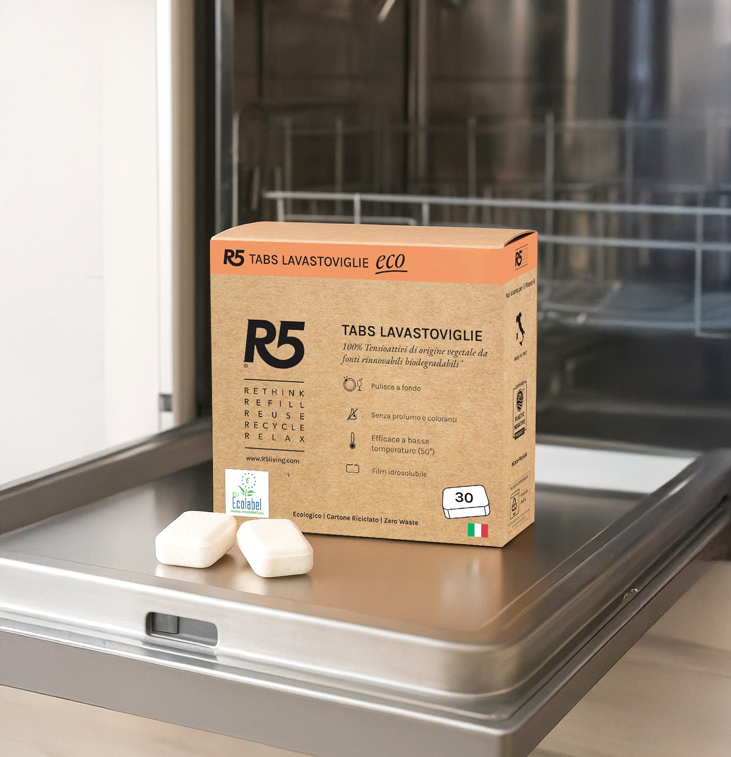 Tabs Lavastoviglie con il 100% di tensioattivi di origine vegetale da fonti rinnovabili biodegradabili*.