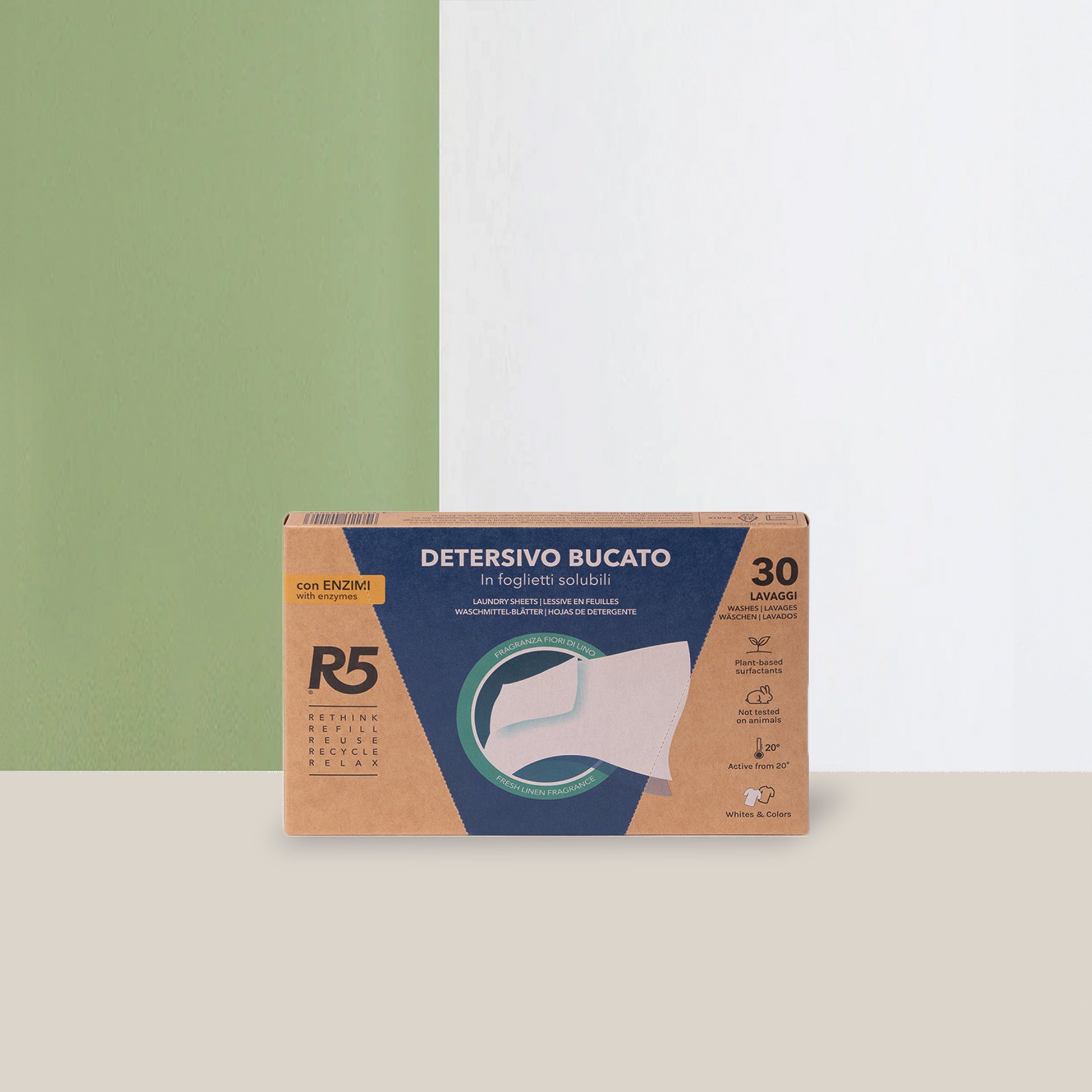 R5 Detersivo in Foglietti Solubili con Enzimi è il nuovo detersivo in foglietti solubili, pensato per una maggior efficacia, grazie all'utilizzo degli enzimi e una ancora più semplice modalità di utilizzo.