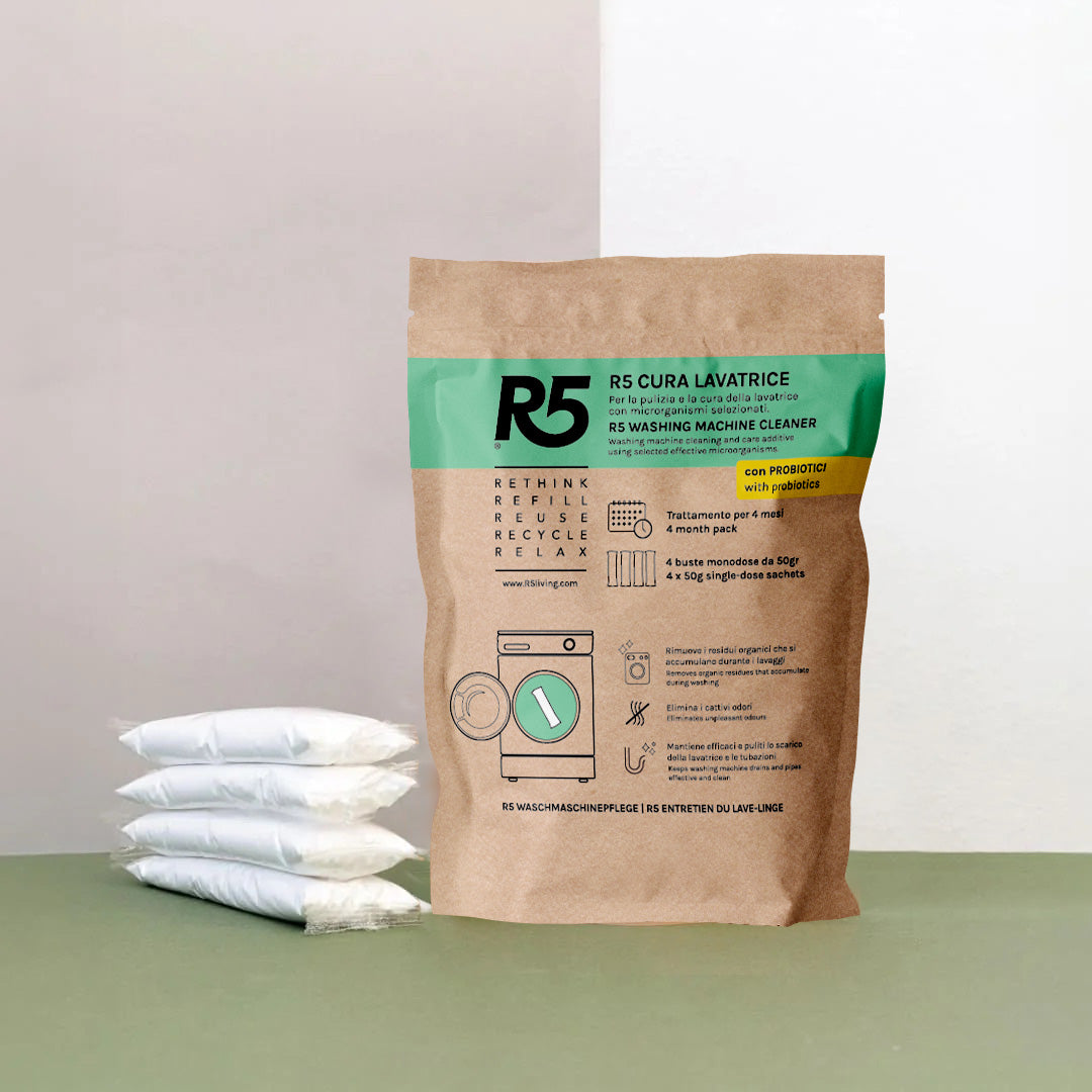 Una lavatrice pulita a fondo è la garanzia per un bucato fresco e pulito.Da oggi, lo sporco, i residui organici e le muffe che si annidano negli interstizi del cestello e nelle guarnizioni della lavatrice, non saranno più un problema. E addio anche ai cattivi odori.R5 Cura Lavatrice è un additivo per la pulizia e la cura della lavatrice con l'ausilio di microrganismi effettivi selezionati, noti spesso con il nome di probiotici.R5 Cura Lavatrice:
