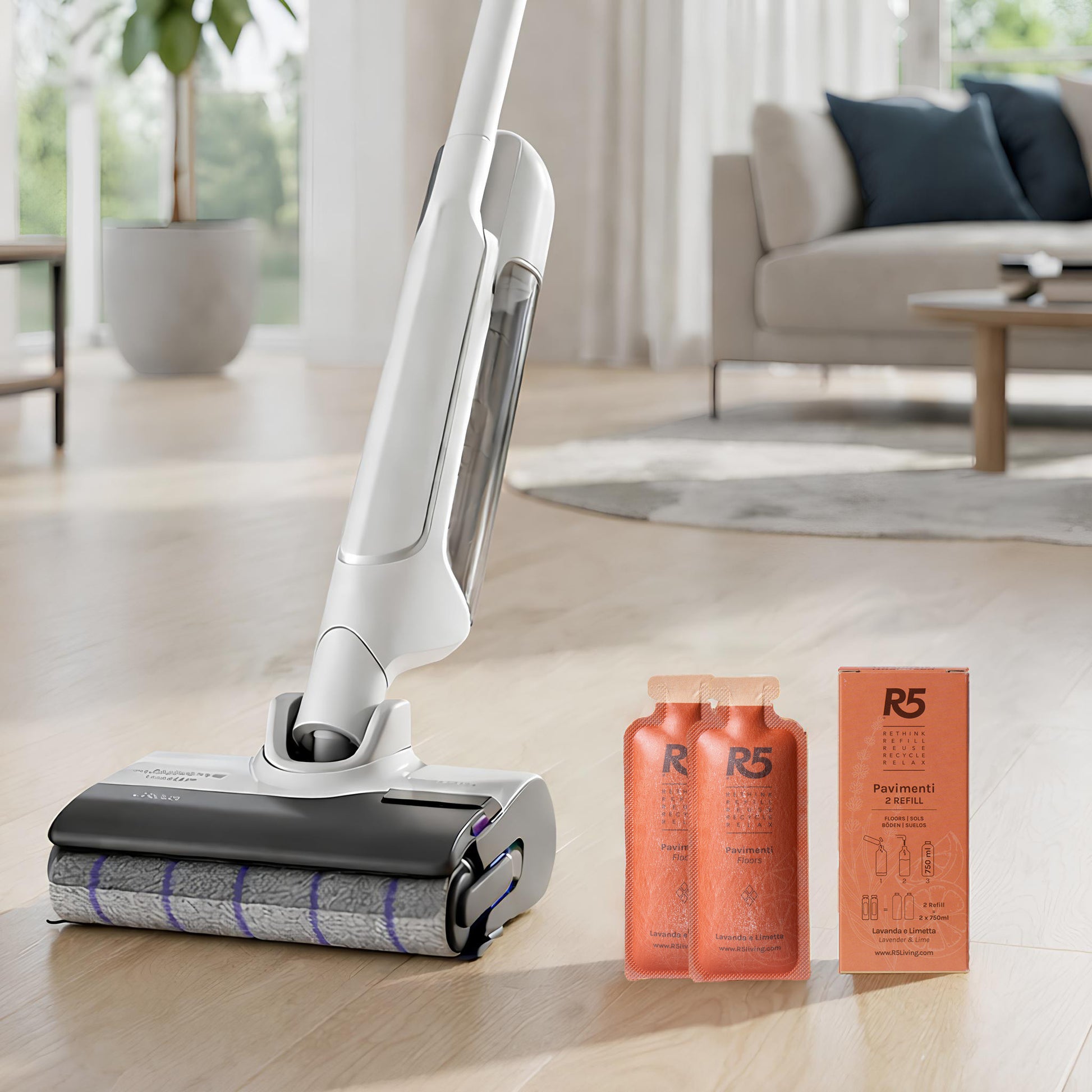 Con tensioattivi di origine vegetale da economia circolare 1 refill = 1 flacone da 750ml. In ogni confezione ci sono 2 refill, con cui si preparano 2 flaconi da 750ml.R5 Pavimenti è adatto per la pulizia di tutti i tipi di pavimento, profuma, pulisce a fondo tutte le superfici lavabili senza lasciare residui e senza risciacquo.