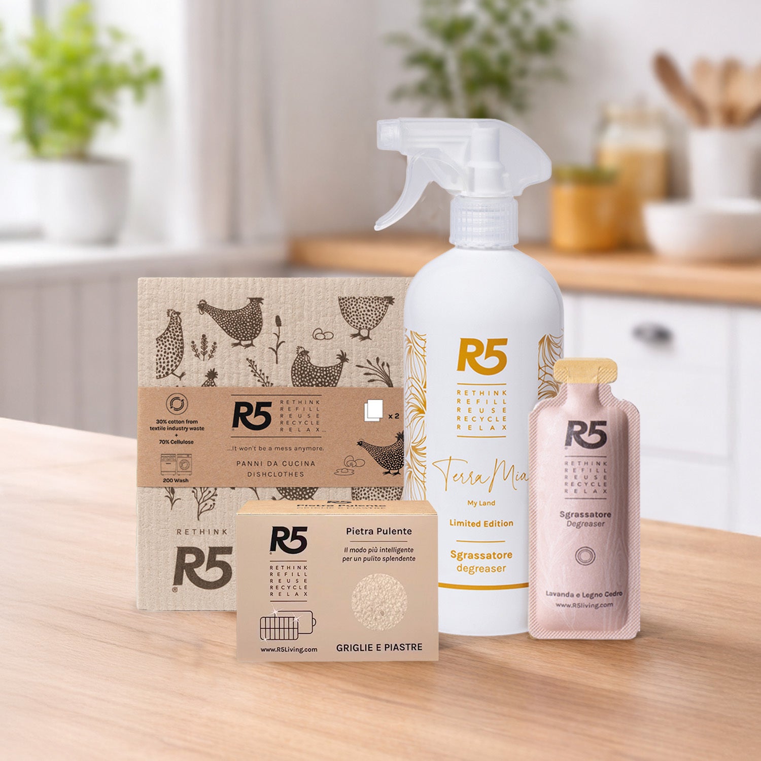 R5 Kit Sgrassatore: Scatola esterna: Carta PAP 21, raccolta differenziata Carta. Flacone: Plastica PET, raccolta differenziata Plastica. Trigger(spruzzino): Plastica Other 7, raccolta differenziata Plastica. Anellino chiusura: Plastica Other 7, raccolta differenziata Plastica . Refill:carta C/PAP 81, raccolta differenziata Carta R5 Panno Spugna: Carta PAP 20 - Raccolta Differenziata Carta R5 Pietra Pulente Griglie e Piastre: Box PAP20, raccolta Carta